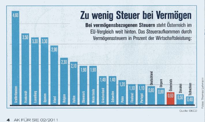 Die Vermögenssteuer wurde bereits 1993 abgeschafft, die Erbschafts- und Schenkungssteuer lief mit Mitte 2008 aus, die Berechnung der Grundsteuer ist wegen der veralteten Steuerbasis (Einheitswerte) viel zu gering. Das alles trägt dazu bei, dass Österreich dauerhaft auf den letzten Plätzen aller Industriestaaten liegt, was das Aufkommen aus Steuern aus Besitz und Vermögen anlangt. Nur 0,6 Prozent des BIP werden so aufgebracht, der Schnitt der EU-15 ist mit 2,1 Prozent mehr als drei Mal so hoch. Eine Angleichung würde für Österreich jährlich mehr als 4 Mrd. Euro Mehreinnahmen bringen.  so sieht man das in Deutschland ->